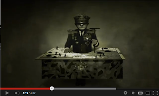 More firm anti-war imagery with a person in a skeleton costume also in an army hat. This is symbolising the death of soldiers albeit not in a grotesque way. The movement of the soldier is also quite disturbing. The way he writhes around is unusual and abstract. This adds to the almost otherworldly tone of the music video.